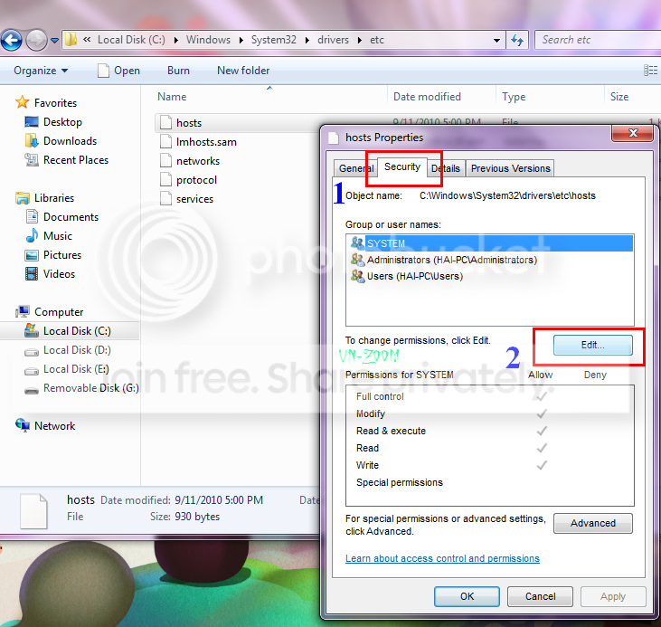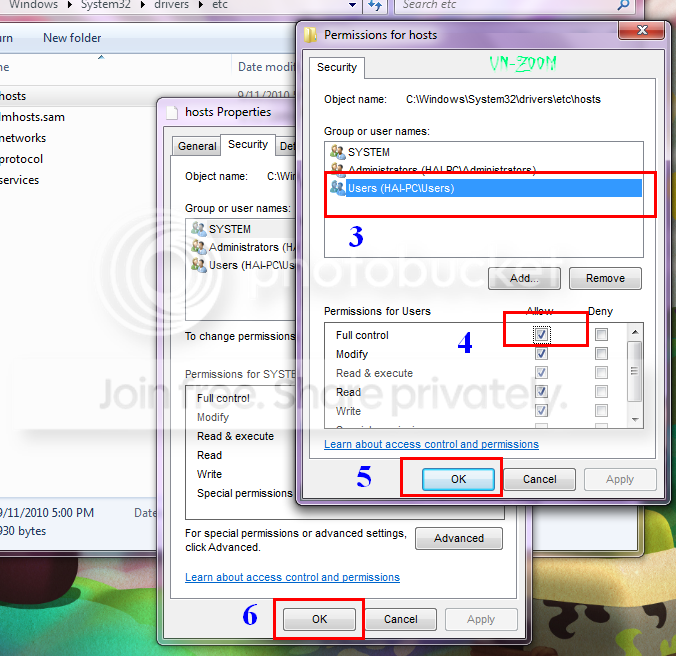 Chú ý: Nếu ko save đc 3 dòng trên vào host (Win7), các bạn Click chuột phải vào file host --> Properties --> chọn tab "Security" -->...............